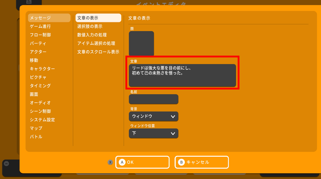 まずは「顔」項目で顔グラフィックに関する設定を行います。文章を画面上に表示するコマンドですが、文章と同時に顔グラフィックを表示することもできます。村人やキャラクターの会話表現を作る場合は顔グラフィックを選びましょう。