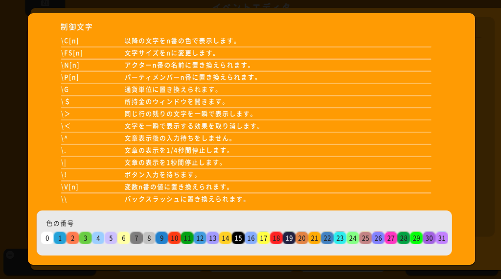 | \C[n] | 以降の文字をn番の色で表示します。各色の番号 | 会話中に重要なワードなどが出た場合 |