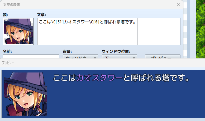 なお、「文字の色」の制御文字は「以降の文字を指定した色に変える」命令になり、設定した文章の表示命令ではその色が継続して続いてしまいます。特定の部分だけ強調するために色を変えたい場合は「ここは\C[31]カオスタワー\C[0]と呼ばれる塔です」のように、変えたい文字の冒頭で変えたい色を指定した制御文字を入れ、もとに戻したいタイミングで「\C[0]」(文字の色で色番号0を入力した制御文字)を入れてあげましょう。