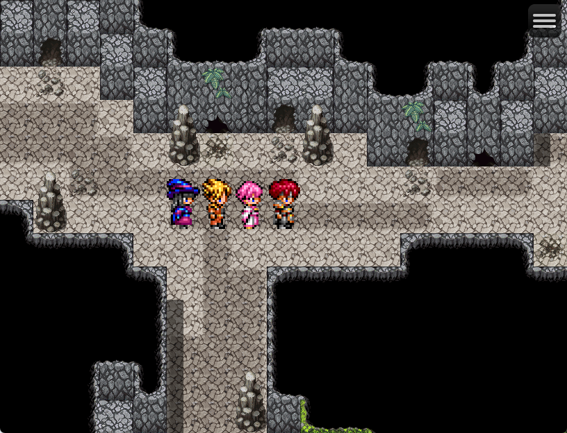 上記の画像は、サンプルマップ「洞窟内部2」に今回紹介している「MEGA FANTASY 歩行アクター and 顔グラ」の歩行グラフィックを設定したアクターをパーティに入れて隊列歩行させた画像です。
