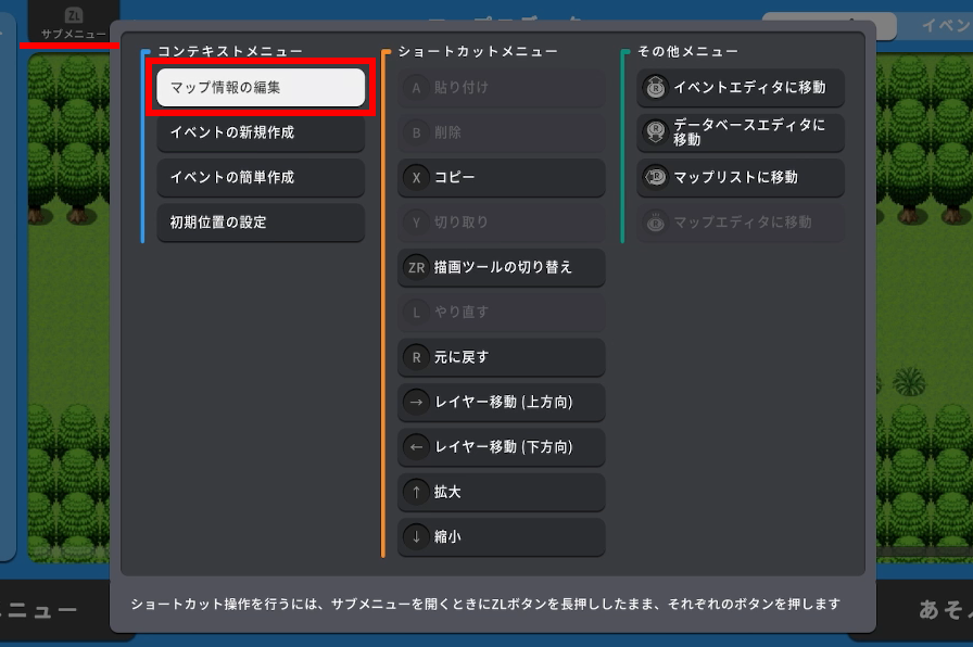 戦闘背景を指定したいマップを開いた状態で、XLボタンをサブメニューを開き、マップ情報の編集を選択します。